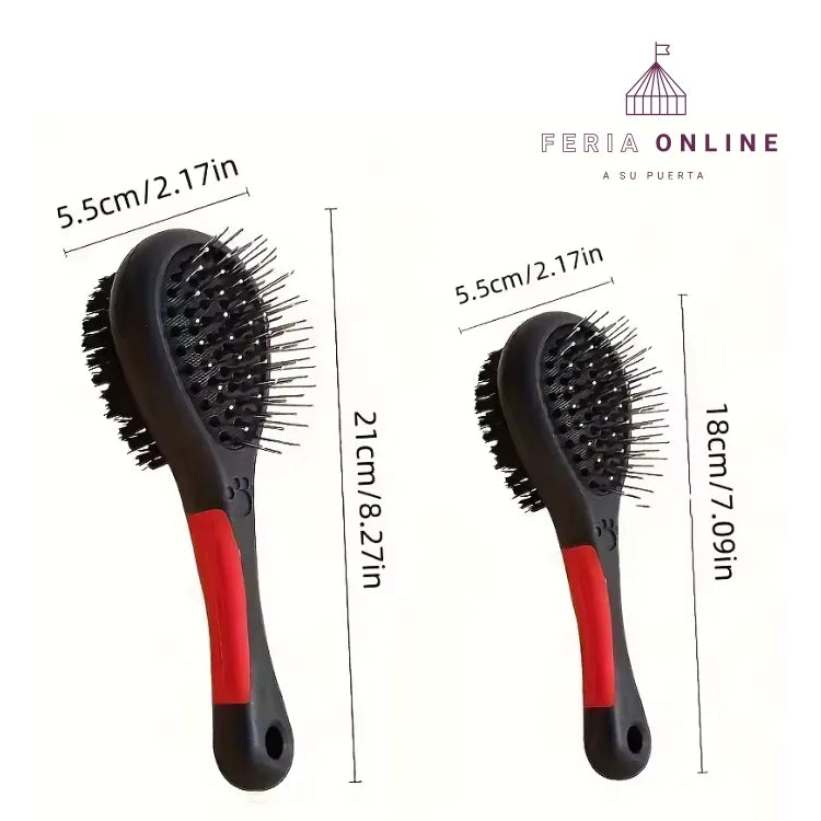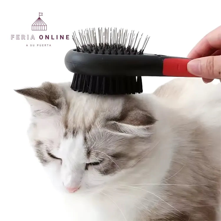 Este cepillo tiene doble función: un lado con cerdas metálicas largas y puntas de plástico para desenredar sin lastimar, y otro con cerdas cerradas que eliminan pelo muerto y suciedad, dejando el pelaje limpio y brillante.