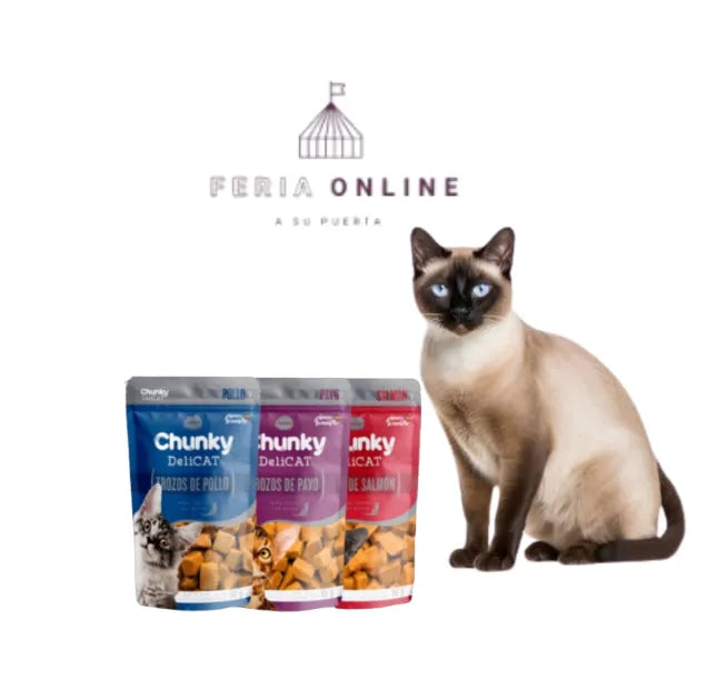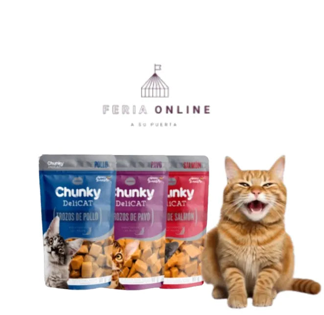 escucha abrir el sobre. Imagina verlo lamer el plato hasta la última gota. Con ingredientes seleccionados, sin conservantes artificiales y con proteínas de alta digestibilidad, Chunky DeliCAT es salud y sabor en equilibrio. ¡Nutrición