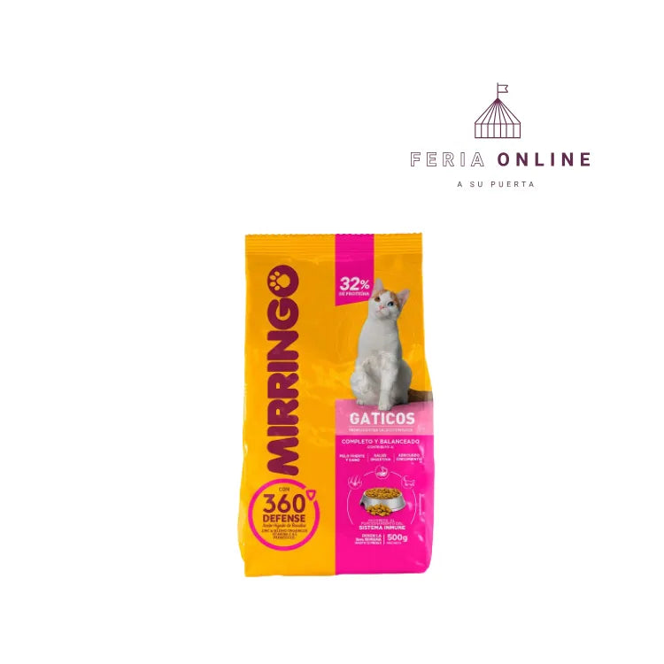 ¿Diarreas, mal aliento o poca energía? ¡No más! Mirringo Gatitos, con su fórmula 360° Defense, 32% de proteína y prebióticos, fortalece a tu gatito desde adentro. Pelo brillante, buena digestión y vitalidad total en cada croqueta. ¡Dale el poder de crecer sano y feliz desde hoy!