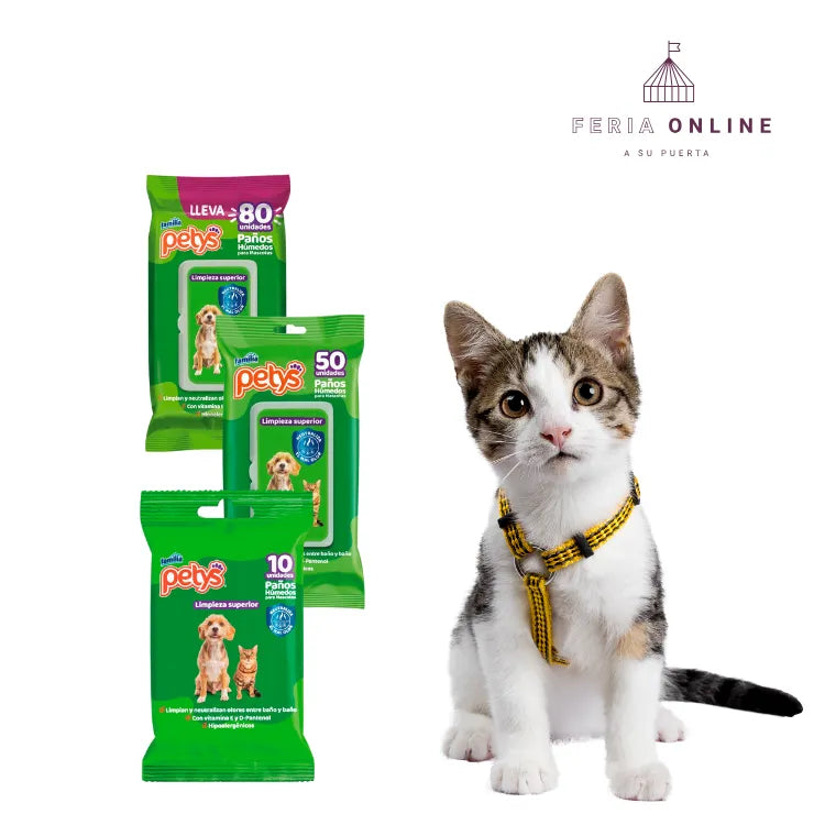 Te presentamos los Paños Húmedos para Mascotas Petys de Familia han sido cuidadosamente formulados para limpiar el cuerpo de tu perro o gato de forma rápida, segura y efectiva. Diseñados con un agradable aroma, estos paños no solo limpian, sino que neutralizan los malos olores, manteniendo a tu mascota fresca entre baños.